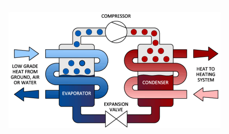 The technology inside the heat pump is similar to any domestic refrigerator, which uses a vapourcompression cycle. The main components in the heat pump are the compressor, the expansion valveand two heat exchangers (an evaporator and a condenser).